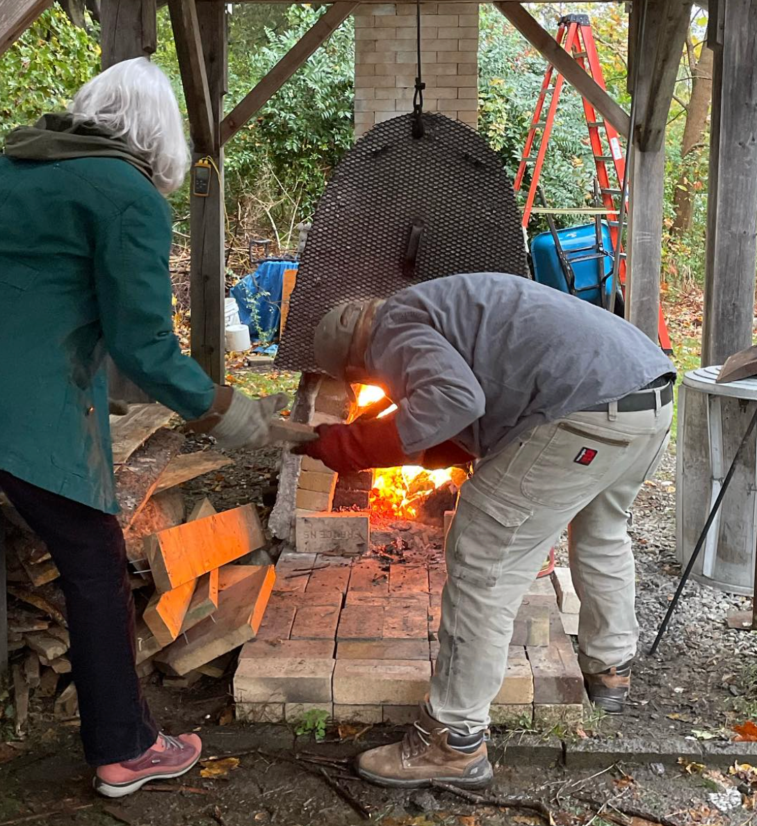 Staff and volunteers help load the kiln and stoke the fire to maintain the desired temperature. Wood firings are informal, community-centered events, with participants often bringing food and drinks to share while gathering around the fire.