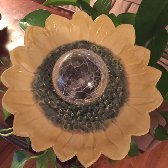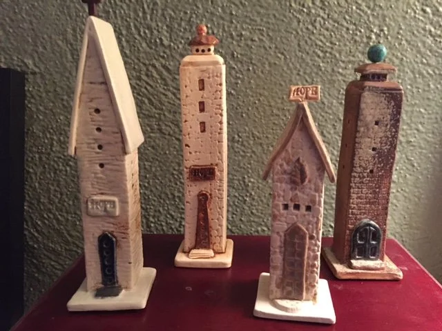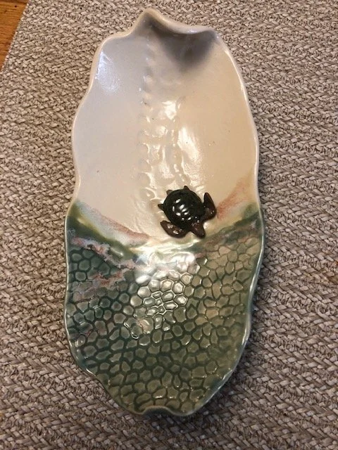 I create pottery items including solar flowers, Towers of Hope, and Sea Turtles. I also make watercolors and silk painted scarves.