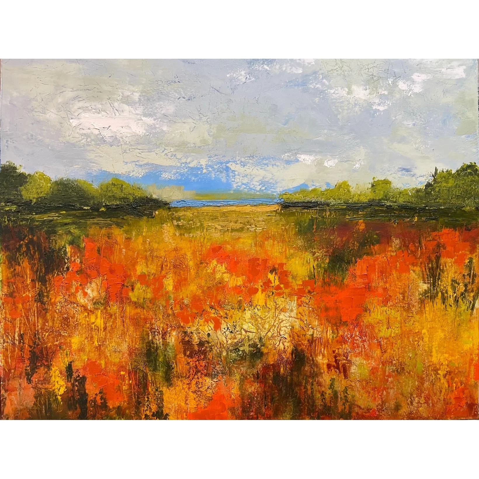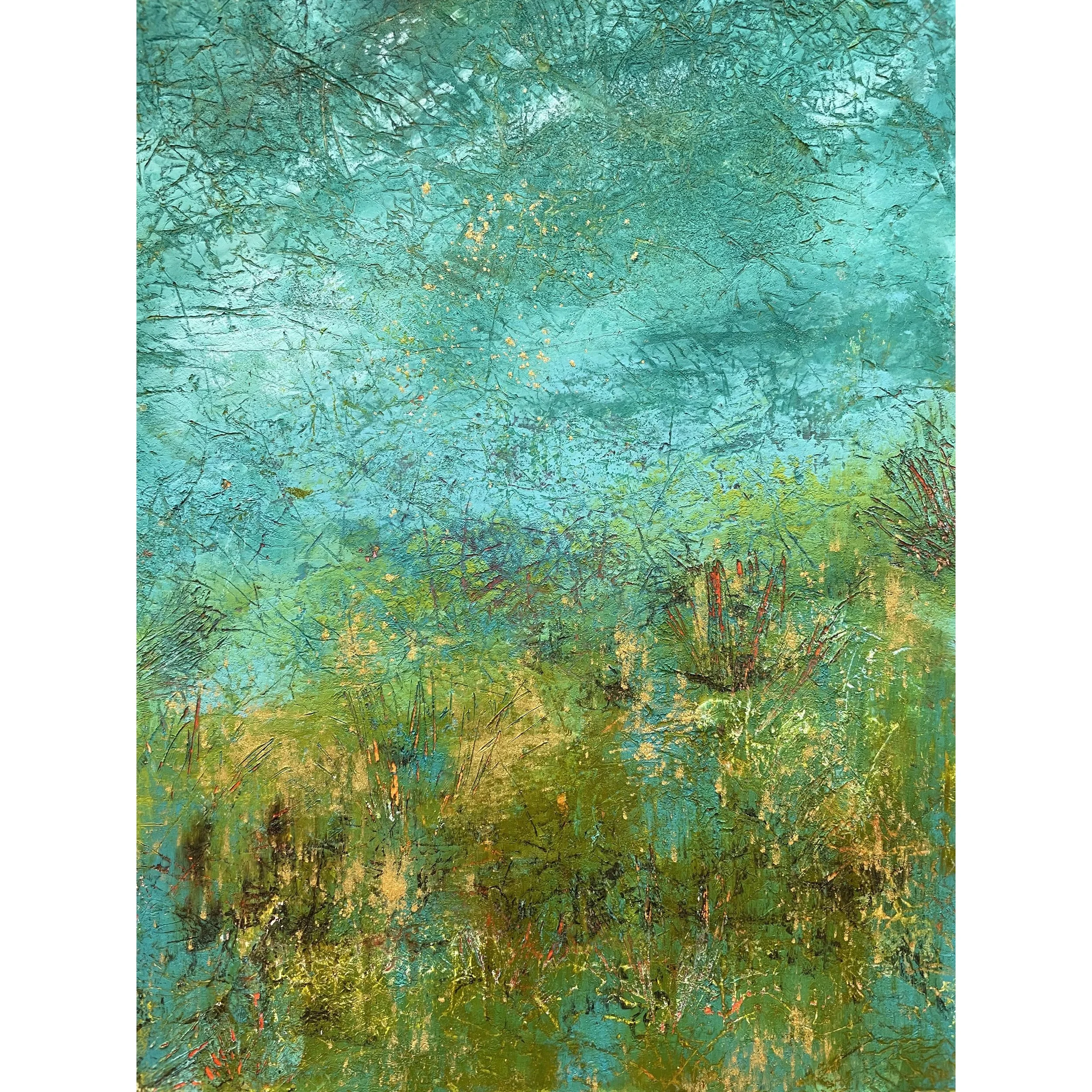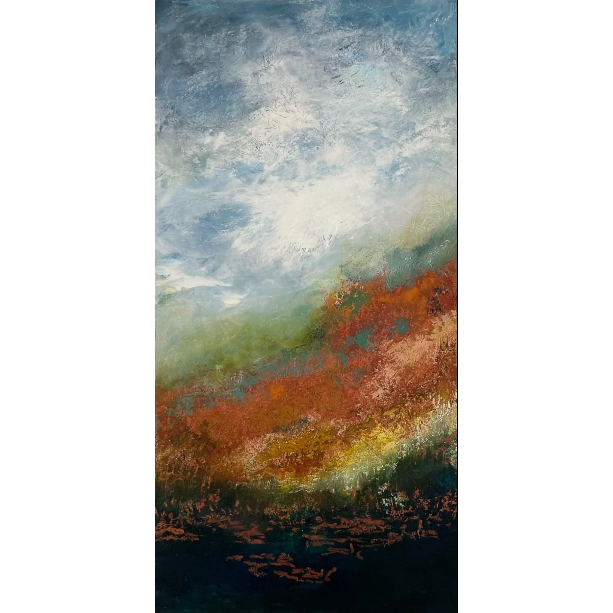 I am originally from Pawtucket but my husband and I lived for 35 years in the metropolitan DC area. We moved back to Rhode Island during the pandemic and landed in a 225-year-old home in West Warwick, complete with one of the oldest corn cribs in the state. I have explored many mediums including polymer clay, needle felting, and watercolor. Currently, I am focusing on oil and cold wax, in addition to mixed media collage. These mediums usually take the form of abstract landscapes.