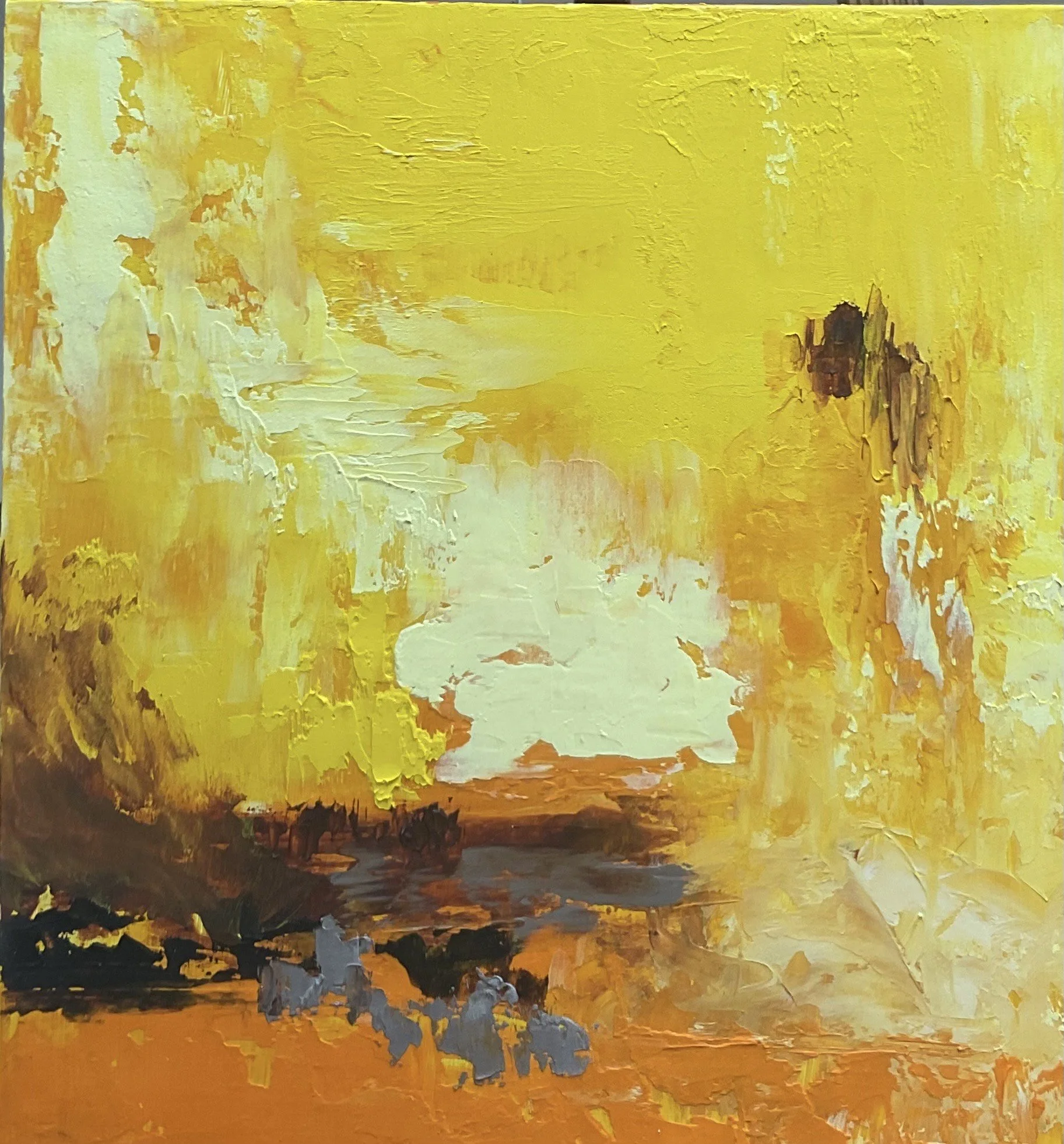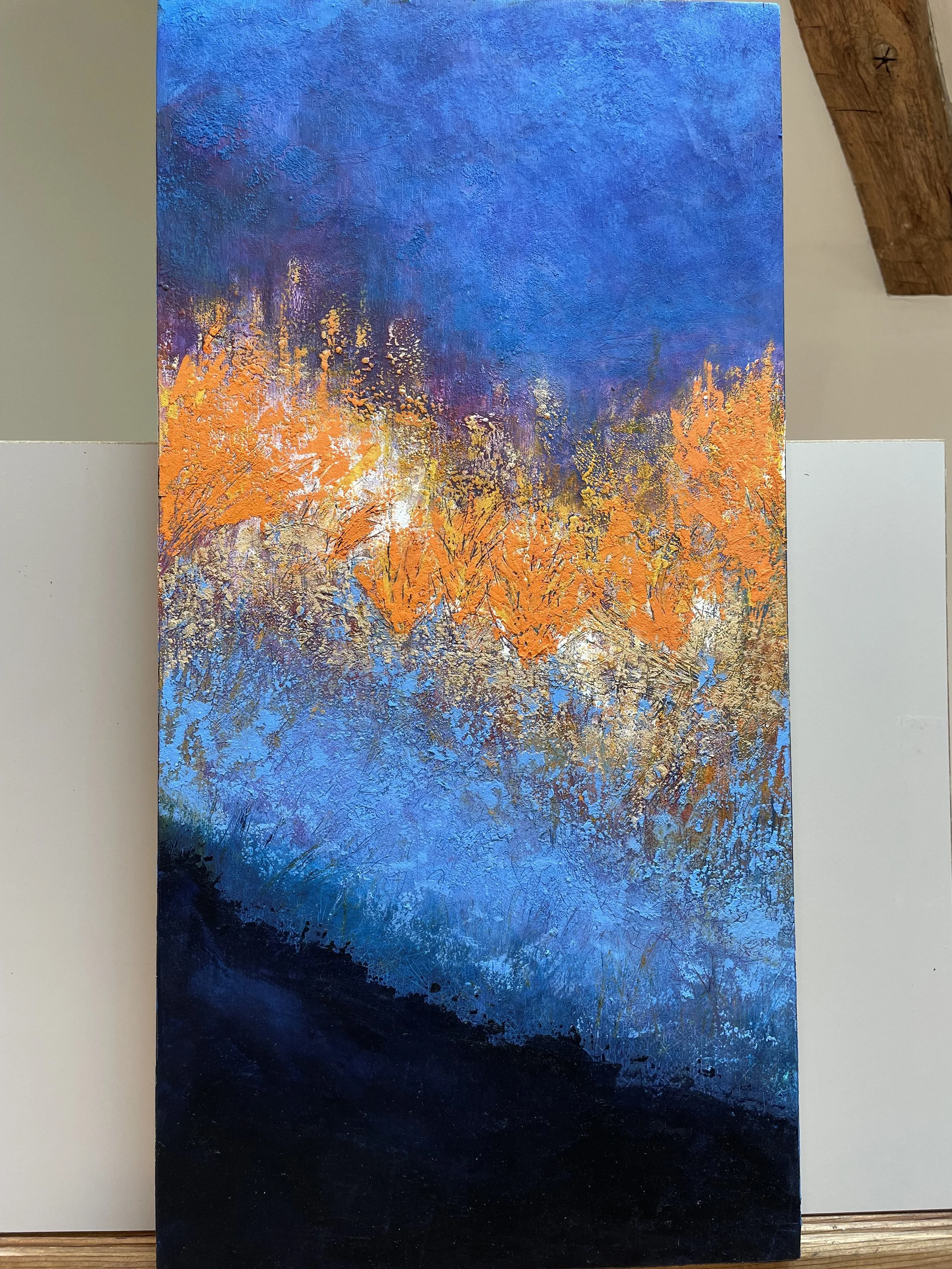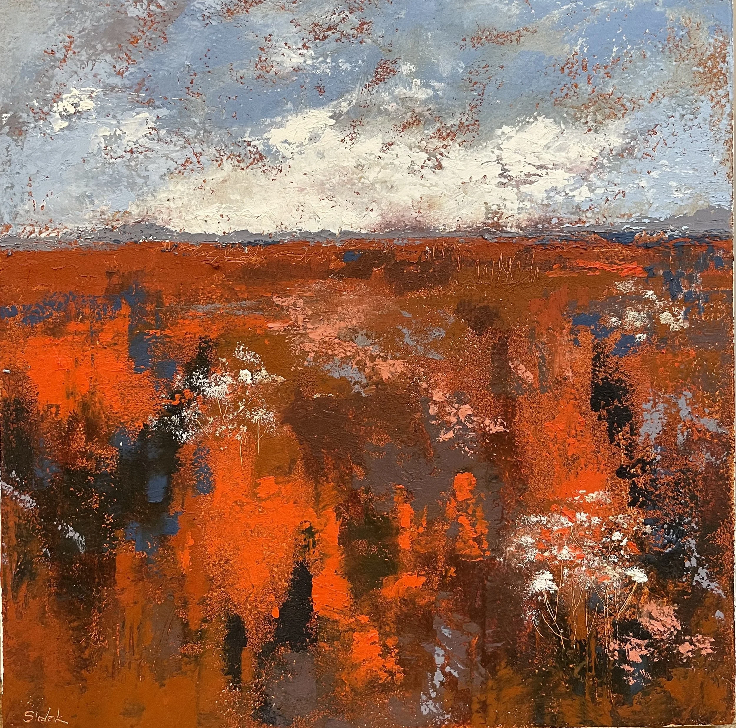 I am originally from Pawtucket but my husband and I lived for 35 years in the metropolitan DC area. We moved back to Rhode Island during the pandemic and landed in a 225-year-old home in West Warwick, complete with one of the oldest corn cribs in the state. I have explored many mediums including polymer clay, needle felting, and watercolor. Currently, I am focusing on oil and cold wax, in addition to mixed media collage. These mediums usually take the form of abstract landscapes.